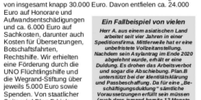 Das Projekt „Plan.B“ berät und unterstützt geflüchtete Menschen im Landkreis Tübingen und der weiteren Region bei allen Bedarfen rund um das Asylverfahren und das Aufenthaltsrecht. Trotz der schwierigen Umstände und Einschränkungen durch die Corona-Pandemie war 2021 bei Plan.B ein sehr aktives Jahr....