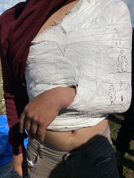 Afghanischer Flüchtling. Am 30. März wurde ihm beim „Pushback“ von der kroatischen Polizei die Schulter ausgekugelt. Noch einen Monat muss er den Gips tragen.