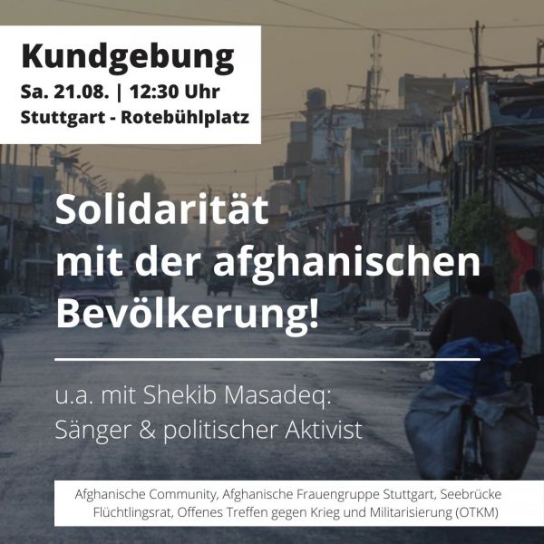 Angesichts der schockierenden Bilder aus Afghanistan, der tiefen Sorge über die Situation ihres Landes und das Schicksal der dortigen Menschen ruft die afghanische Community in Stuttgart und Umgebung für den kommenden Samstag (21. August) um 12.30 Uhr zu einer Kundgebung auf dem Rotebühlplatz auf. Der in der afghanischen Community sehr bekannte Sänger und Aktivist Shekib Masadeq wird dabei auftreten, es wird eine große Beteiligung seitens afghanischer Menschen erwartet. Umso wichtiger ist, dass möglichst viele kommen, um ihre Unterstützung und Solidarität zu bekunden! Der Flüchtlingsrat, das Offene Treffen gegen Krieg Stuttgart und die Seebrücke Stuttgart waren den afghanischen Aktivist*innen bei der Organisation der Kundgebung behilflich. Bitte kommt zahlreich und verbreitet / teilt den Aufruf!