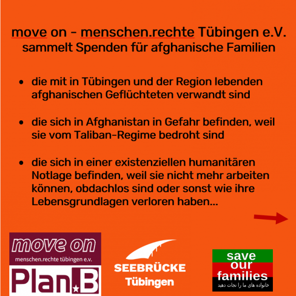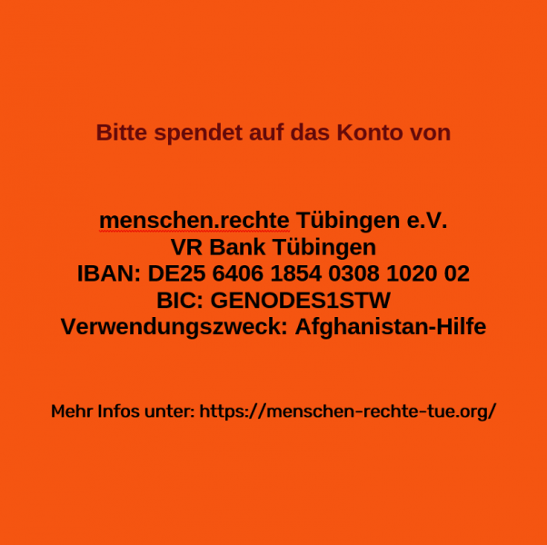 Aus diesem Grund bittet der als gemeinnützig und mildtätig anerkannte Verein um weitere Spenden auf das Konto menschen.rechte Tübingen e.V., VR Bank Tübingen, IBAN: DE25 6406 1854 0308 1020 02, Verwendungszweck: Afghanistan-