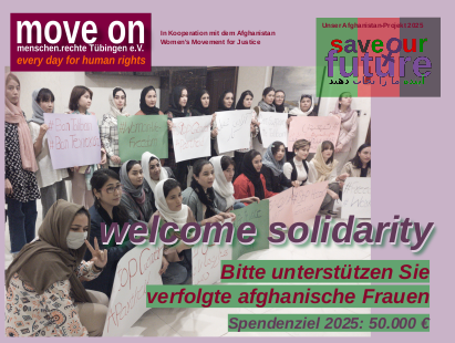 Schon seit mehreren Jahren helfen wir afghanischen Frauen und Familien, die in Not und/oder Gefahr sind, die vom Taliban-Regime verfolgt sind, die auf der Flucht sind oder die von der Abschiebung nach Afghanistan bedroht sind. Diese Aktivitäten, bei denen wir schon viel erreichen konnten, wollen wir auch im Jahr 2026 fortsetzen. Hierfür bitten wir um solidarische Spenden!